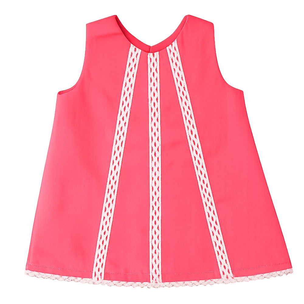 La Batita 3 Encajes Rosa para niña combina dulzura y frescura en un diseño encantador. Su vibrante tono rosa resalta con tres aplicaciones verticales de encaje en color natural que estilizan la prenda y aportan un toque artesanal distintivo. Su corte amplio tipo A y diseño sin mangas brindan comodidad y libertad de movimiento. El delicado acabado inferior con encaje completa una pieza ideal para días soleados y ocasiones especiales.