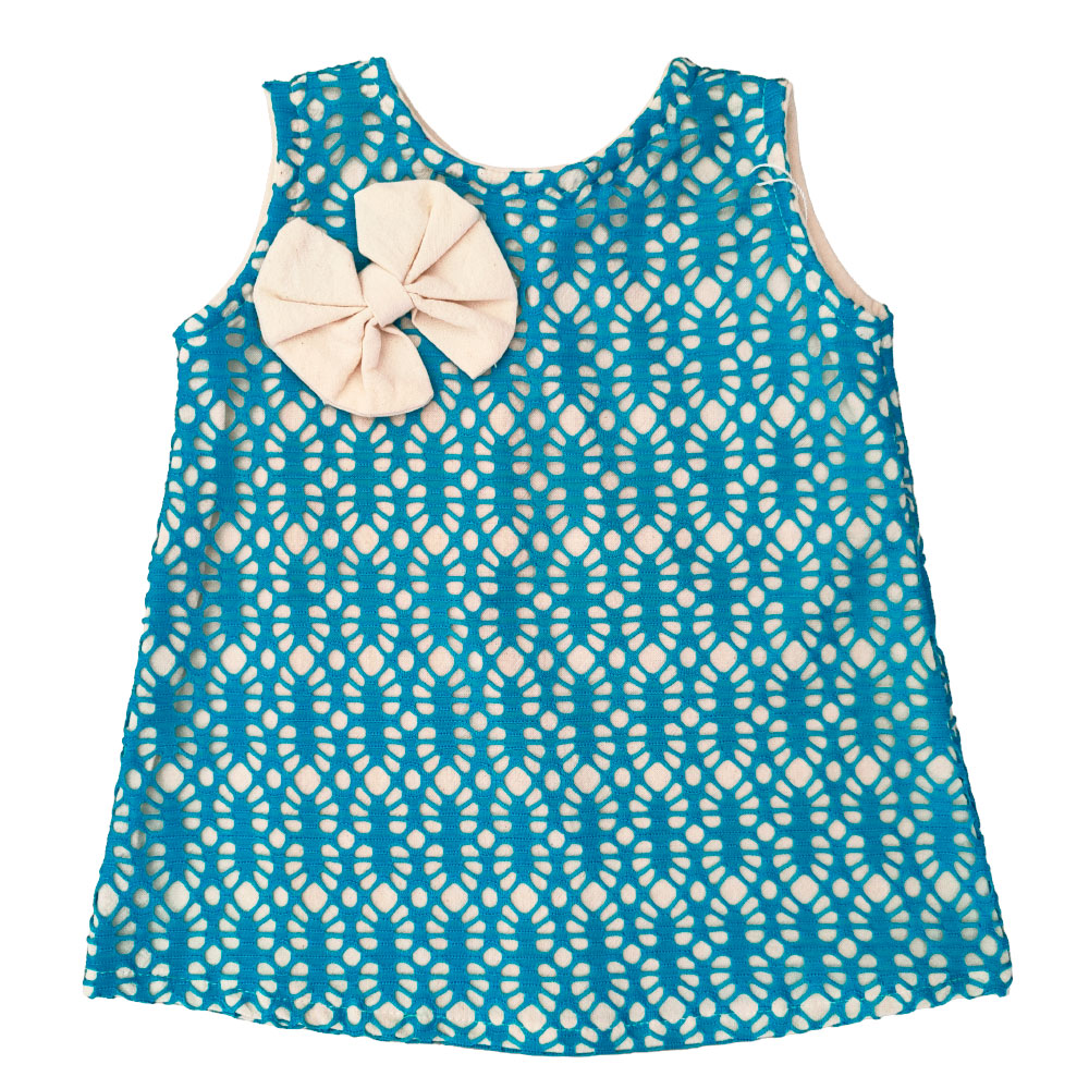 La Batita Lluvia Azul de Temporada para niña combina frescura y encanto artesanal. Confeccionada en delicado encaje calado en tono azul vibrante, revela un sutil fondo claro que realza su diseño. Su corte amplio sin mangas brinda comodidad y libertad de movimiento. Destaca un moño decorativo en tono natural que aporta dulzura y contraste, perfecta para ocasiones especiales o días soleados.